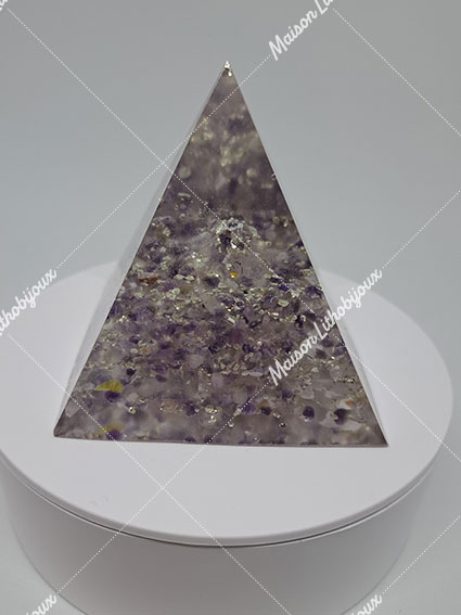 Orgonite en Améthyste et quartz en forme de pyramide.